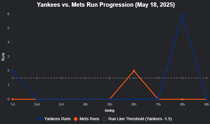 On May 18, 2025, when the Yankees and Mets met in the Subway Series, it created a perfect situation for those who wagered on the run line. The Yankees won big (8-2) over the Mets thanks to Cody Bellinger, who hit a game-winning grand slam and drove in six runs.